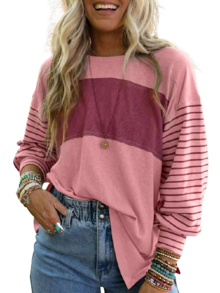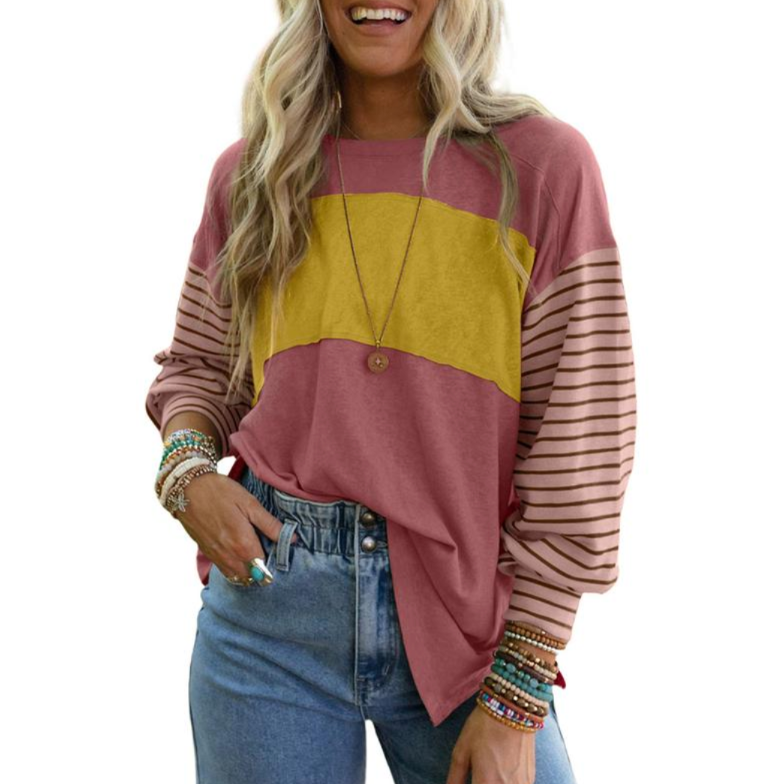 Bold colorblock meets striped sleeves — a fresh twist on casual wear.