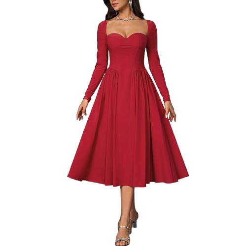The Amelie Elegance Dress is where timeless beauty meets modern sophistication. Featuring a structured sweetheart neckline, long fitted sleeves, and a flowing A-line skirt, this piece flatters your figure while exuding grace and confidence. Designed from premium stretch fabric for comfort and movement, it’s the perfect choice for evening dinners, holiday events, or romantic occasions.